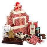 This classic 10-layer holiday tower contains a variety to holiday treats that are fun and satisfying for all ages. For chocolate lovers, the tower contains eight ounces of assorted chocolates, six chocolate covered sandwich cookies, eight red foil covered stars, one bag of dark and one bag of mint-filled Ghirardelli chocolate squares(4.87 ozs each), and eight Lindt chocolate balls. Also included are two shortbread nutcracker-shaped cookies, one holiday gingerbread man, six ounces of caramel popcorn, one four ounce box of chocolate chip biscotti, spicy cocktail nuts (1.5 ozs), and cranberry cookies (7.0oz).
